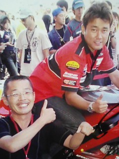 そんな彼がテストライダーとして終わってはもったいない!と私は思っていました。もちろん彼も思わない訳はありません、スズキの社長と交渉。やっとの思いで一戦出ていいぞと許しを得て、去年のJSB1000(事実上日本の最高峰)鈴鹿サーキット。世界のレベルと同等だといきなり彼はやってくれました。 8年ぶりのレースでいきなりコースレコードにポールポジション!ジャイアンツの4番に無名(秋吉はライダーの仲間では有名でした)の選手が出てきていきなりホームラン!何て感じでした。ホンダの伊藤真一選手も「お前出るのかよ・・」なんて本人に言ったとか。